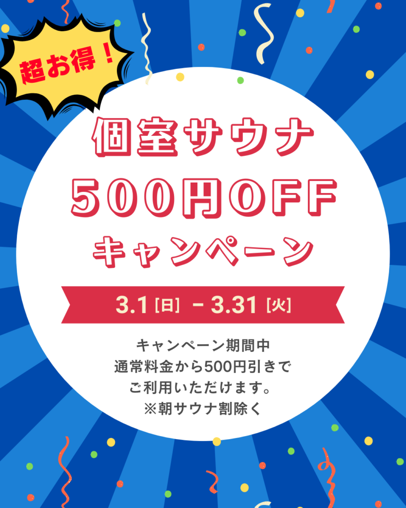 3月限定で個室サウナ料金500円OFFキャンペーンを実施いたします!